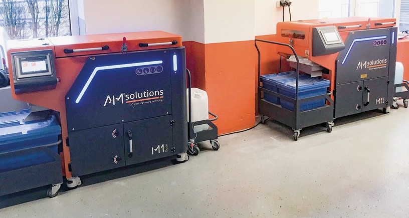 Um Kunden einbaufertige 3D-gedruckte Kunststoff- und Metallkomponenten bieten zu können, setzte das Dienstleistungsunternehmen Klaus Stöcker Metallbearbeitung bei der Nachbearbeitung zunächst auf manuelle Prozesse. Aufgrund einer stetig steigenden Nachfrage sowie immer höheren Anforderungen an die Prozesssicherheit und Reproduzierbarkeit des Post Processing investierte das Unternehmen in die automatisierten Lösungen S1 für das Entpulvern sowie die M1 Basic von AM Solutions – 3D post processing technology, die das effektive und wirtschaftliche Glätten und Homogenisieren der Oberflächen ermöglicht.