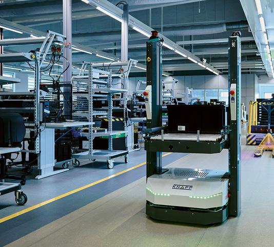 Routenzüge und Open Shuttles verbinden das automatische Kleinteilelager nahtlos mit den Produktionslinien. Behälter mit Komponenten werden von den AMR in die Produktion transportiert und dort auf einer Fördertechnik den Mitarbeiterinnen und Mitarbeiter bereitgestellt. Leerbehälter sowie fertig produzierte Teile nehmen die Open Shuttles anschliessend wieder auf und bringen sie zur Zwischenlagerung zurück ins Evo Shuttle.