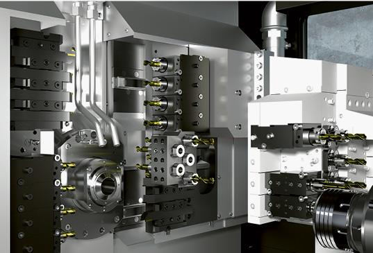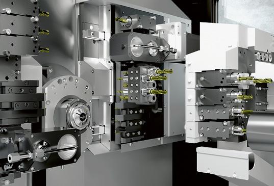 Die 9-Achsen-Version verfügt zusätzlich über eine Z2-Achse, welche besonders bei Bohrungen in grosser Tiefe oder bei simultaner Bearbeitung auf Haupt- und Gegenspindel ihre Vorteile ausspielt. Darüber hinaus kann die Maschine mit einer B-Achse erweitert werden, die Plug-&-Play integriert wird. Damit eröffnen sich neue Möglichkeiten für schräge Bearbeitungen, den Einsatz von Hochfrequenzspindeln oder das flexible Indexieren von Werkzeugen.