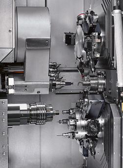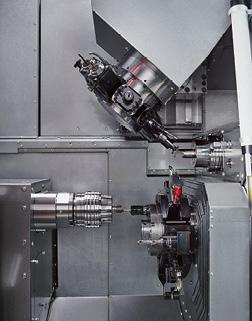 Die Variante TNK40-11 enthält einen zusätzlichen Frontapparat mit autonomem Kreuzschlitten in Z- und X-Achse sowie einer NC-Schwenkachse, also insgesamt elf Linearachsen. Dieser zweite obere Werkzeugträger verfügt über sechs Plätze. Drei der Werkzeugaufnahmen sind angetrieben, eine ist sogar mit einem Doppelhalter bestückbar. Für alle Ausführungen steht optional ein Rückapparat mit vier Werkzeugaufnahmen zur Verfügung, der auf dem unteren Revolver aufgebaut ist.