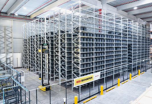 SSI Schäfer hat das durch einen Sicherheitszaun geschützte Kommissionierlager nahtlos in den Materialfluss der Halle eingebettet. Die Einlagerung ist über eine Fördertechnik angebunden, welche die Stückgüter in Behältern zu den RunBots leitet. Hinter einer Sicherheitsschleuse nehmen die RunBots die Behälter auf und fahren sie zu einem der 360 Pufferstellplätze. Dort wird die Ware von den RackBots übernommen und zu ihren Stellplätzen im Regallager gebracht.