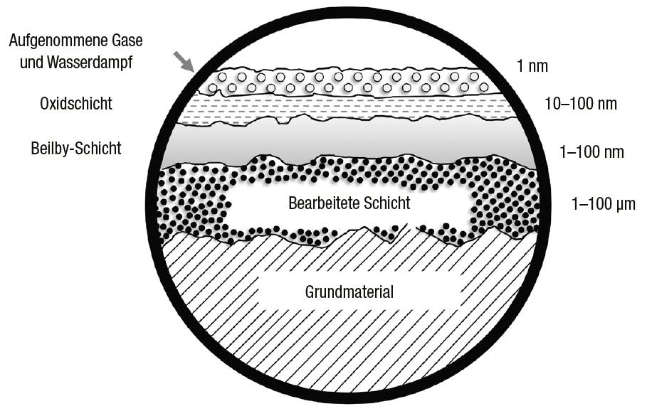 Bei der mechanischen Endbearbeitung wie Kaltumformung, spanender Bearbeitung und mechanischen Poliervorgängen an Edelstahloberflächen wird der oberflächennahe Gefügebereich erheblich verändert. Hohe Spannungen und Verschiebungen unmittelbar unter der Oberfläche führen zu einer gestörten Zone im Metallgitter mit einer erhöhten Zahl an Gitterfehlern, einer ungleichmässigen Spannungsverteilung sowie zu einer sehr dünnen, oberen Schicht, der sogenannten Beilby-Schicht mit teilweise aufgelöster, genauer formuliert amorphisierter Struktur und eingepresstem Fremdmaterial. In dem gesamten Störungsfeld «Bearbeitete Schicht» und «Beilby-Schicht» (Bild 4) liegen deutlich mehr Gitterfehler und Gitterinhomogenitäten vor als im Grundmaterial.