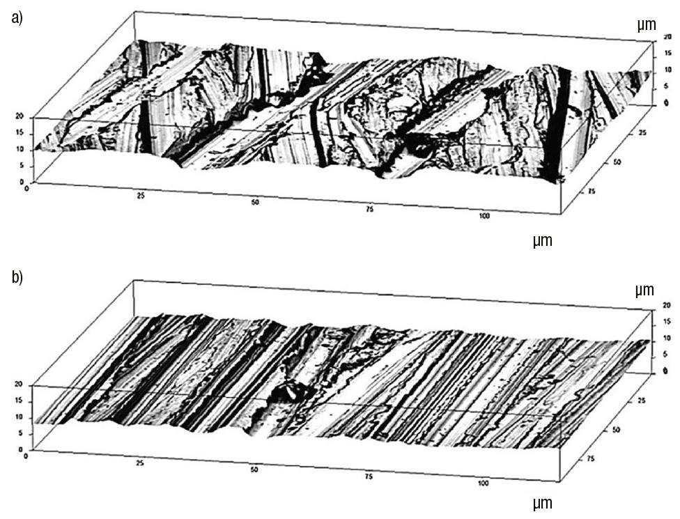 Wie beispielsweise allein durch die Anpresskraft beim Schleifprozess die Oberflächentopografie verändert wird, zeigen die Untersuchungen von Burkert, Klapper und Lehmann (Bild 5). Neben den erheblichen Topografieunterschieden, die durch den unterschiedlichen Anpressdruck ausgelöst werden, haben elektrochemische Rauschmessungen gezeigt, dass die Wahrscheinlichkeit für die Entstehung von Lochfrass an Proben etwa um die Hälfte niedriger ist, wenn sie mit normalem statt hohem Schleifdruck geschliffen wurden. Insgesamt verbleiben nach dem Schleifen zahlreiche Oberflächendefekte wie Spalten oder Materialüberlappungen (Bild 3), die sich negativ auf die Korrosionsbeständigkeit auswirken. Ausserdem wird das Gefüge beim Schleifen unterhalb der Zerspanungszone insbesondere bei dem hohen Anpressdruck sehr stark verändert und mit Fehlern respektive Versetzungen angereichert. Das dabei entstehende Störungsfeld nimmt ebenfalls Einfluss auf die Korrosionsbeständigkeit.