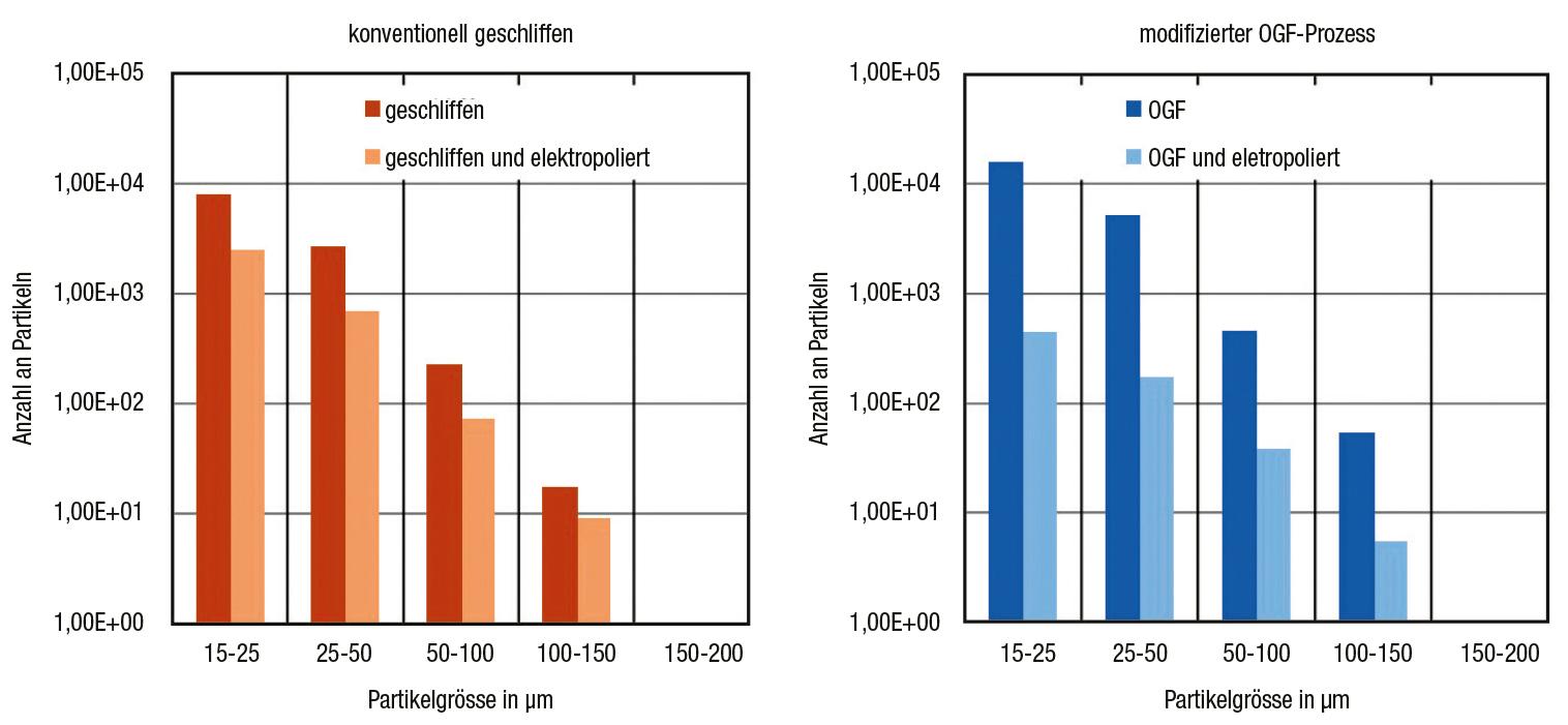 Eine erste Einschätzung zum Einfluss des OGF-Verfahrens auf die Partikelanhaftung lieferten Restschmutzanalysen. Ein vergleichender Versuch in Anlehnung an die Normen VDA19.1 (März 2015) sowie ISO 16232 (Dezember 2018) wies nach, dass durch die Bearbeitung nach dieser Methode die Anhaftung von Restmaterial deutlich reduziert wird (Bild 6). Die Auswertung bezieht sich auf die Anwendung des OGF-Verfahrens durch das Unternehmen Bolz Intec, das einen neuen Weg zur Verbesserung seiner Produkte suchte. Das Elektropolieren führt sowohl an der konventionell mechanisch bearbeiteten als auch bei der OGF-bearbeiteten Oberfläche zu einer Reduzierung der anhaftenden Partikel. Ein direkter Vergleich der finalen elektropolierten Oberflächen zeigt jedoch, dass die OGF-bearbeitete Oberfläche insbesondere bei den kleineren Partikelgrössen deutlich weniger anhaftende Partikel aufweist. So liegt für die Partikelgrösse 15 bis 25 µm der Durchschnitt bei 2.442 bis 440 Partikeln (Reduzierung um etwa 82 Prozent) und für die Partikelgrösse 25 bis 50 µm bei 693 bis 172 Partikeln (Reduzierung um etwa 75 Prozent).