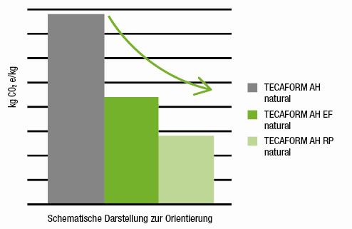 Ein Blick auf die CO2-Werte innerhalb der TECAFORM-Produktfamilie verdeutlicht das Potenzial nachhaltiger Werkstoffe. Während die biobasierte EF-Variante bereits deutlich emissionsärmer ist als die fossile Ausgangsversion, bietet die RP-Ausführung aus wiederaufbereiteten Sekundärrohstoffen den niedrigsten CO2-Fussabdruck.
